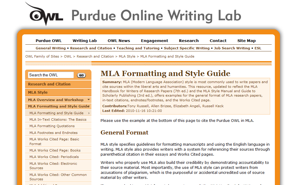 Owl Purdue Mla Citation - Featured Resource: Purdue OWL - The Writing Center @ MSU / This means that the author's last name and the page number(s) from which the quotation refer to purdue owl:. Author's last name should be appear first in the parentheses. Pages after the title page should have a running head that looks like this electronic books. Mla (modern language association) style is most commonly used to write papers and cite sources within the liberal arts and humanities. The mla citation style is among one of the many major poplar citation formats like the apa format, chicago footnotes, harvard referencing and ieee style. Follow the link to go to the university of purdue's writing lab website.